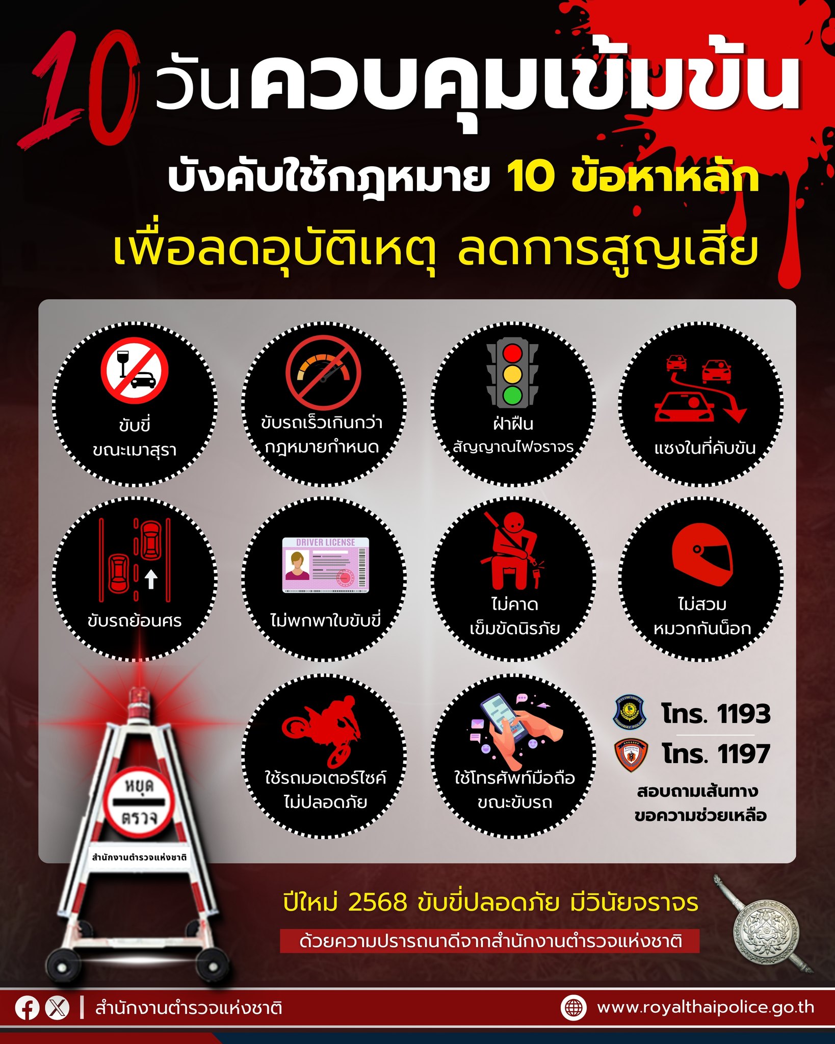 จำนวนคนดู: 199 10 วันคุมเข้ม 10 ข้อหาหลัก เพื่อลดอุบัติเหตุบนท้องถนนสำนักงานตำรวจแห่งชาติห่วงใยพี่น้